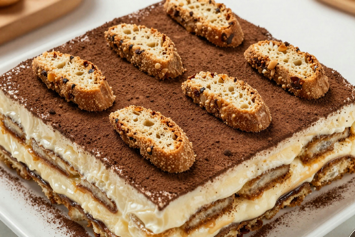 Immagina di dare un tocco a questo classico. Aggiungendo i cantuccini, il dolce toscano che ha una storia altrettanto interessante. I cantuccini sono biscotti secchi arricchiti con mandorle, che vengono tradizionalmente serviti con un bicchiere di Vin Santo. Questa combinazione è perfetta: l’intensità del cantuccino croccante e il suo sapore di mandorla si uniscono alla cremosità del tiramisù.